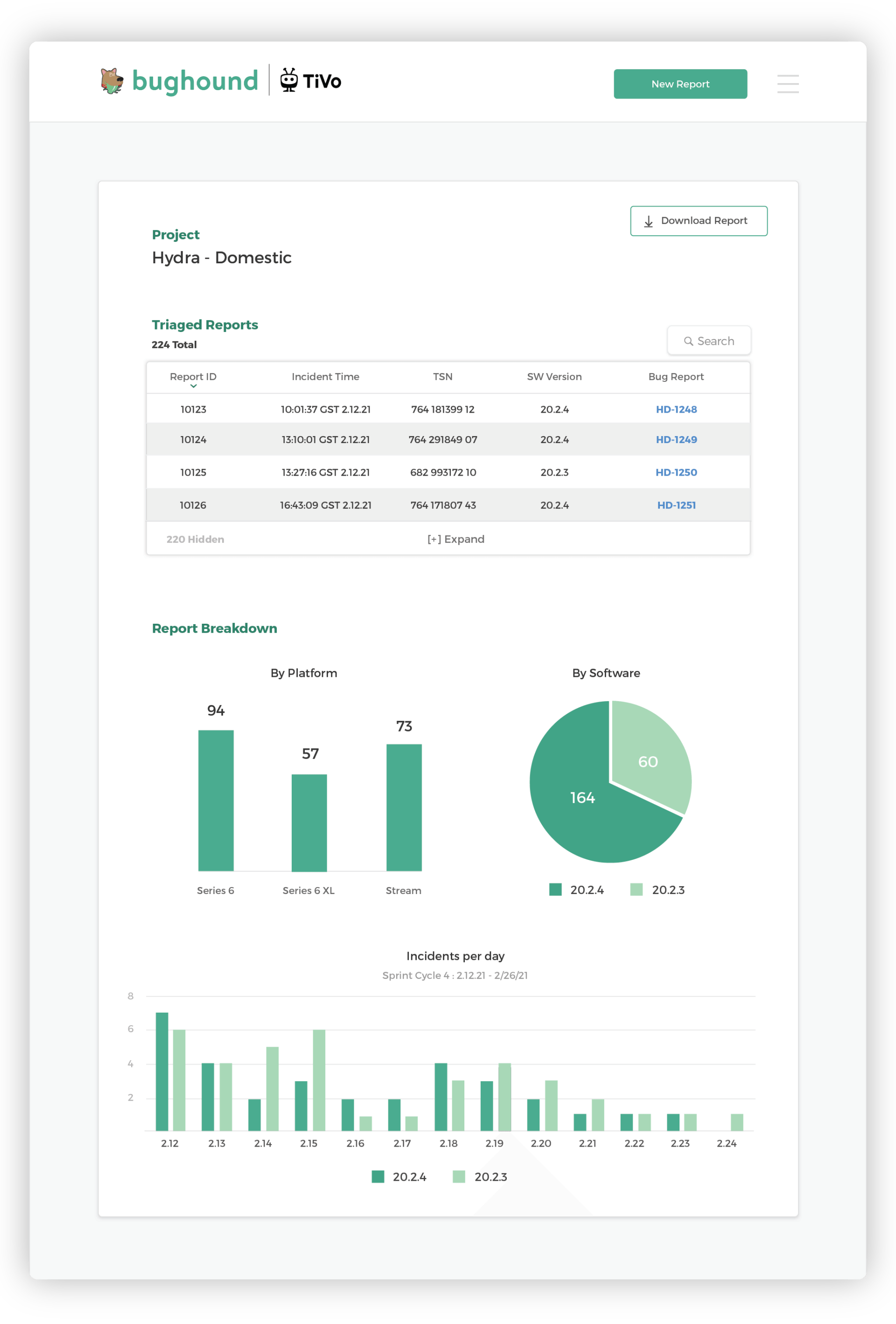 Bughound was a tool I designed and developed for the TiVo Field Trials team. The Field Trials team was responsible for managing the Alpha (internal TiVo employees) and Beta (external TiVo customers) software testing programs. These groups were tasked with performing various tests on pre-release software and reporting any issues they encountered - including UX pain-points or feature requests. These reports were filed through the Field Trials testing portal. Shortly after I had joined the team, I found that a significant portion of my time was being spent manually copying over report details and device error logs to engineering's bug tracking portal. I decided to build Bughound, a tool that automatically generated initial bug reports and ran analysis on test feedback metrics (e.g., breakdown of issues filed by device, software, day, etc.). The time gained from cutting out these mind-numbing cut-and-paste tasks allowed our team to conduct deeper analysis of the issues and minimize the need for back-and-forth between our team and engineering.